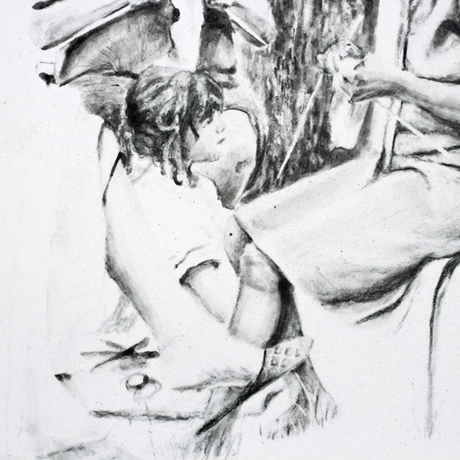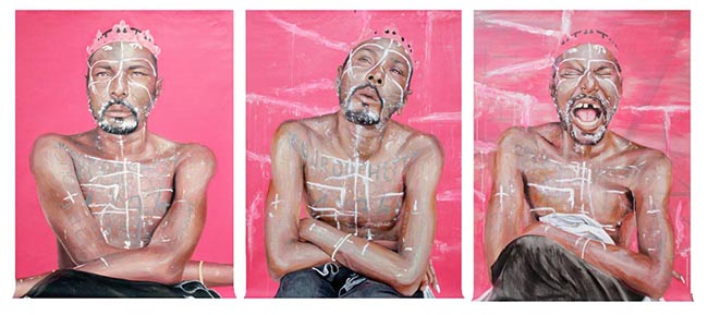 De l’île, l’artiste scrute les plis et les replis avec une sorte d’introspection qui la mène à la rencontre des marginaux qui vivent dans la rue. Peindre la figure humaine, n’est-ce pas déjà marquer un intérêt à l’autre, à ce qui nous entoure et à soi ? À la façon d’une ethnologue, Stéphanie Hoareau s’immerge dans leur quotidien dans un souci de partage et d’échange. De ce travail de terrain surgit un ensemble de portraits intimes et pudiques, Eloge vagabond – 2015, des grands formats peints avec réalisme. Sans mise en scène, les figures nues sont exposées à notre regard et dans ce face à face déconcertant on accède à l’intériorité de l’être(1).