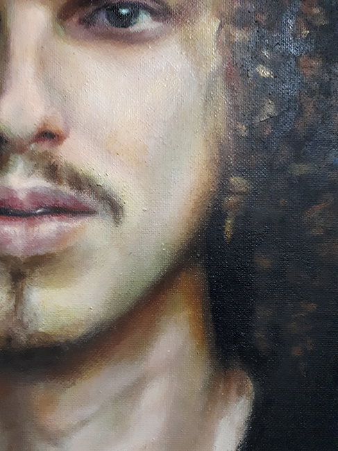 L’usage du portrait, figure majeure de l’art, revient de manière récurrente chez Stéphanie. Dans cette nouvelle série (en pied cette fois-ci), elle aborde la figure de l’artiste comme on se regarde dans un miroir. L’intérêt principal du portrait réside dans la représentation du visage, du regard. Puis ce sont les mains qui jouent de langage, la peau, la bouche. L’habit se fait parures, les étoffes et les draperies magnifient les sujets, renvoyant au deuxième plan le décor qui n’est plus que prétexte. Une composition travaillée dont l’objectif est d’attirer le spectateur dans un face à face. L’auteur nous rappelle qu’avant tout la peinture est un manifeste. C’est à partir de photographies prises avec l’accord et la complicité de ses modèles que Stéphanie Hoareau plonge dans le regard de ceux qui posent pour elle et fait de la peinture tout à la fois la preuve d’une réalité et celle de la création et de la liberté de manœuvre de l’artiste(2).