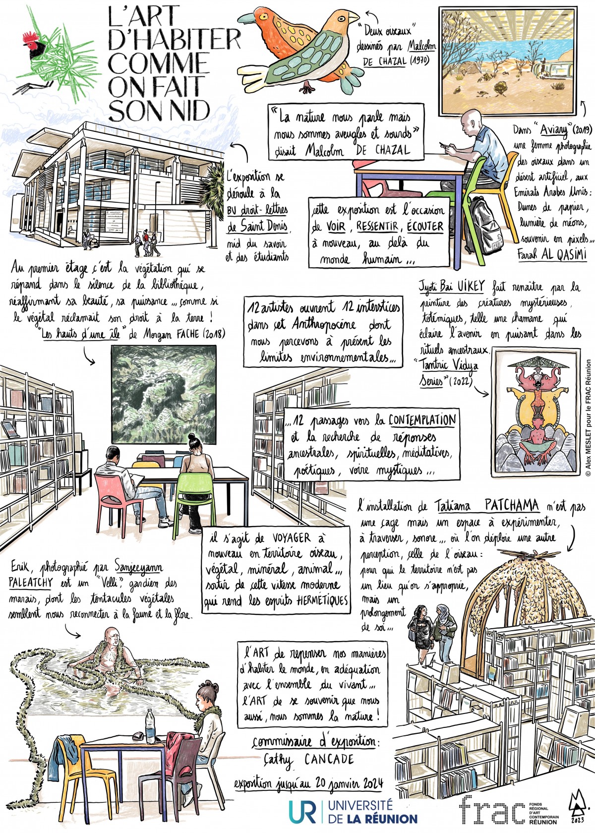 Pour la troisième fois consécutive, le FRAC RÉUNION investit les espaces de la BU Droit-Lettres du campus du Moufia. Si l’exposition “L’art d’habiter comme on fait son nid” s’adresse avant tout aux usagers de la bibliothèque universitaire, elle est également une invitation au grand public à venir découvrir dans ce lieu des œuvres qui interrogent les possibles et les impossibles de nos rapports au vivant . Grâce à une médiation sourde, orchestrée à travers un jeux de piste, ceux qui le souhaitent ont l’opportunité de se placer au plus proches des œuvres exposées et de la démarche de la commissaire Cathy Cancade et des artistes présentés.