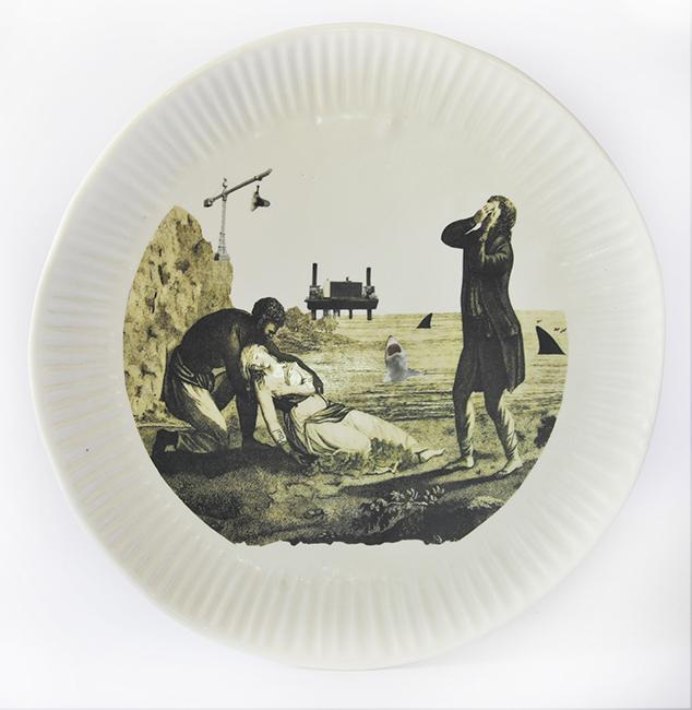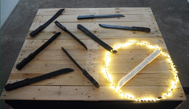 Souvent l’artiste se met en condition de production via des temps d’immersion dans un lieu avec lequel ses œuvres entrent en dialogue. Ainsi Archéologie absente (2013) et Parodie (2015) – séries d’œuvres issues d’une résidence au Musée de Villèle, ancien domaine colonial Panon-Desbassayns – traite à la fois de la mémoire du lieu et de la symbolique des objets de sa collection.” Un service à thé fondu portant le nom d’esclaves marrons tristement célèbres en lettres d’or, des trophées humains ou des fusils de braconniers revisités appellent à une forme de réhabilitation d’une histoire encore cachée, « pour ne pas oublier».