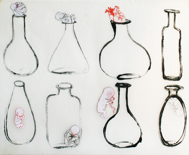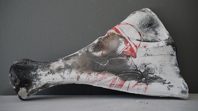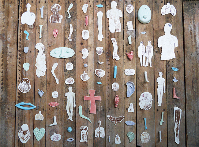 En parallèle, cœurs (série Ker) et ossements (série Bone China) sont des motifs récurrents de son travail, l’artiste y voyant des formes parfaites et évidées d’une anatomie humaine remplie de mystères – contenant cette mémoire du corps et des contes, cathartiques, comme autant de vanités.