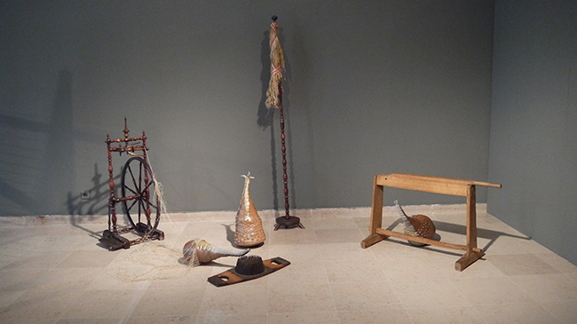 J’investis le Pavillon du FRAC RÉUNION avec une installation constituée de sculptures en céramique, textile, verre, de formes et de motifs, de son et de vidéo, une sorte de cabinet de curiosités, la chambre des merveilles d’une sorcière moderne. Une sorcière qui maitrise la connaissance des simples, de l’alchimie des terres et des couleurs, et qui, telle une Ariane lanceuse d’alerte ou une Pénélope hackeuse, déroule le fil de son réseau sur la toile du web.