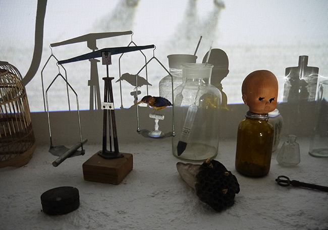 Dans cette atelier de magicienne se côtoient des globes célestes et une dent de géant, des graines d’organes, un coeurs de baleine, Un crâne de cyclope, des fioles aux élixirs magiques, des sécrétions minérales, des anomalies Boschiennes, des fruits délicieux, des ex-voto, des insectes d’or et de carbone et bien d’autres curieuses merveilles.