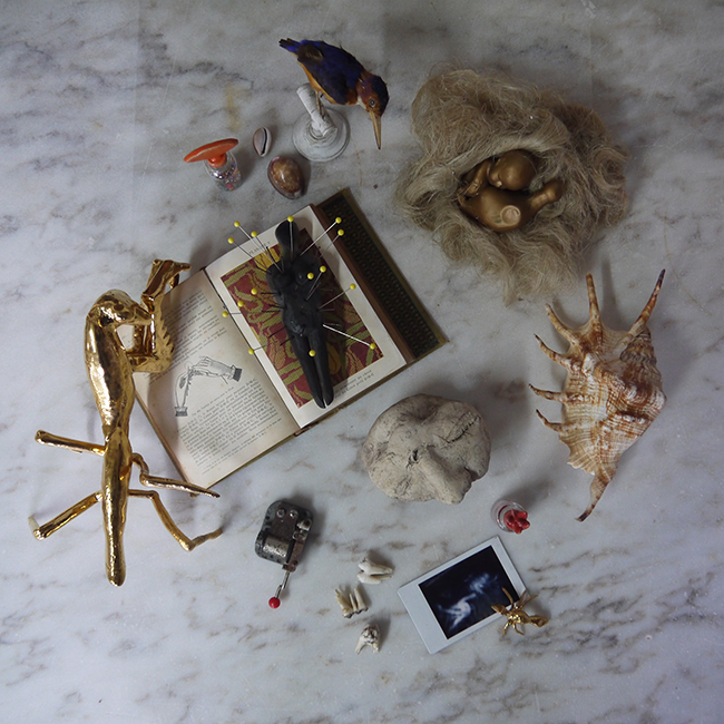 J’ai voulu une invitation surréaliste, magique et spirituelle où l’inconscient et l’irrationnel cèdent au spontané, au mystérieux, au sensible. J’ai voulu ré-enchanter des objets merveilleux et des trésors naturalistes. J’ai voulu un musée personnel ouvert à l’étonnement, au trouble et à l’attirance. En m’appuyant sur la psychanalyse jungienne, je détricote les mythes et les contes peuplés d’archétypes et ainsi je partage des connaissances cachées et pourtant millénaires, des secrets liés au féminin sacré. J’invoque les grandes figures féminines Médée, Circé, Eve, Salomé… Il est question de nature, de destinée et de transmission.