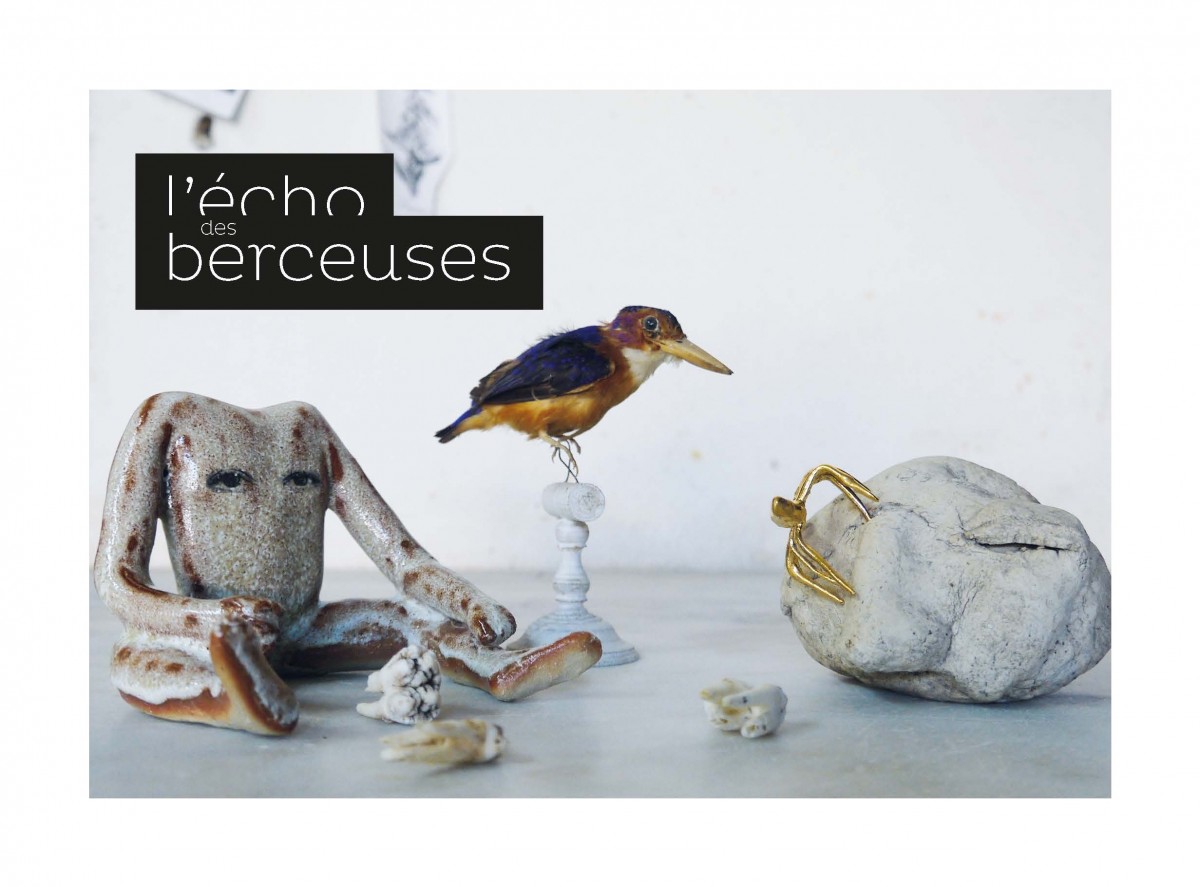 Pour sa prochaine exposition, Alice Aucuit s’attelle à un nouveau corpus – L’Echo des Berceuses (productions 2020) – dans lequel elle réactive l’idée de cabinet de curiosités. Les mises en scènes d’objets hybrides font écho à celles des muséums d’histoire naturelle et jouent avec les repères, entre naturalia et artificalia. Des formes miniatures, rituelles et chimériques font appel aux figures marquant les mythes et légendes de sorcières et autres femmes archétypales : femmes-louves, femmes-oiseaux ou vénus préhistoriques. Au travers de fioles et de boules de verre, de collections entomologiques, de poupées vaudous et de constellations, de carnets et autres éléments de recherches à la fois scientifiques, poétiques et ésotériques, naissent des œuvres ayant trait aux pratiques du fétichisme, de la magie et de l’alchimie. Une bande son diffuse des voix chuchotant des incantations, mêlées à des chants d’oiseaux, au sein d’une scénographie au ton onirique, rappelant en creux les parts sombres liées aux peurs intimes et collectives, à une forme de mélancolie.